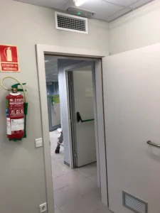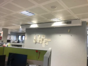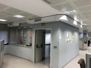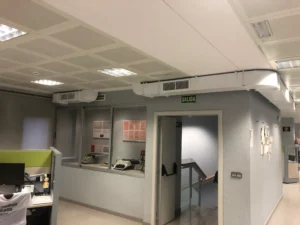 Se trata de un edificio de oficinas que cuenta con un gran patio de trabajadores que atienden vía telemática a los clientes. Dada la morfología de antigua oficina bancaria no se cuenta con la posibilidad de tener ventilación natural. En paralelo con la crisis sanitaria del COVID-19 se opta por la instalación de dos recuperadores de calor que ventilen el patio de trabajo.